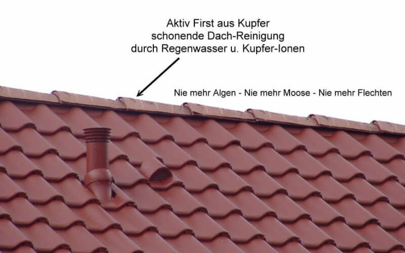 Die spezielle Oberfläche unseres Kupferfirstes bewirkt eine besonders gute Aufnahme der Kupferionen vom Regenwasser durch eine vergrößerte Oberfläche (Profil). Das mit Kupfersulfaten bzw. Kupfer-Ionen angereicherte Wasser reinigt somit die darunter liegende Dachfläche.